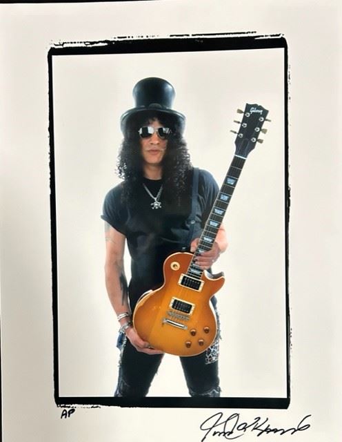 Guns N' Roses guitarist SLASH shows off one of his favorite guitars for renowned Rock photographer Robert M. Knight . Glossy 14x11 print.
