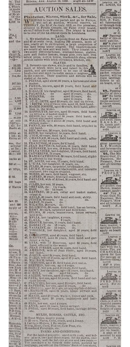 A large selection on slave advertisements, including the auction of an entire riverfront plantation with about 600 acres and 71 named slaves, all contained within The Daily True Delta, Nov. 24, 1859. The paper contains nine smaller ads with woodcuts of slaves, variously proclaiming: "I have received NEAR ONE HUNDRED NEGROES on consignment...Foster's Slave Depot...Carolina and Virginia Negroes for Sale...a large supply of all classes of NEGROES...", etc. The auction advertisement in 11" long and lists each slave's name, age, occupation, family relationship, and any defect or infirmity. This was a fairly large plantation, with 30 mules, 12 horses, and all fixtures offered for sale. The owner, perhaps with great intuition, states that he "...leave the Parish and go to Europe...". Just in time. Typical marginal chipping, else very good.