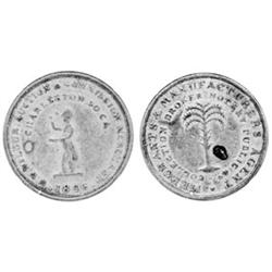 A scarce relic of the slave trade of the mid-1800's, a copper promotional token, 1" dia., issued by the Charleston slave auction house of W. W. Wilbur. The obverse of the coin shows a standing auctioneer with gavel in hand reading: "W. W. WILBUR AUCTION & COMMISSION MERCHANT CHARLESTON, SO. CA. 1846" with the reverse bearing a palmetto tree. Typical wear, generally good to very good condition.