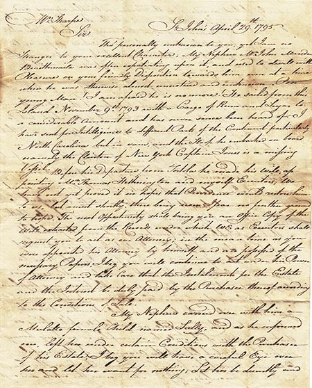 Interesting A.L.S. of one Thomas Braihwaite in St. Johns, Virgin Islands, 4pp. 4to., Apr. 1795 to John Sharpe in New Jersey. Braithwaite was likely a plantation owner, as this letter concerns the disposition of a mulatto girl, in part: "...Tho personally unknown to you, yet I am no stranger to your excellent character. My nephew...was often expatiating upon it...I am afraid he is no more. He sailed from this island November 9, 1793 with a cargo of rum and sugar to a considerable amount and has never since been heard of....Before his departure he made his will appointing Mr. Thomas Hetherington and myself executors...My nephew carried over with him one mulatto female child named Sally and as he informed us here left here under certain conditions with the purchaser of the estate. I beg you will have a careful eye over her and let her want for nothing. Let her be decently and warmly clothed according as the season or weather requires and taught besides reading, writing and arithmatic or cyphering of all sorts of domestic housewifery and economy...plain sewing so as to be able to make her own clothes a man's fine shirt plain or ruffled & washing...These attainments if she can acquire them will make her a useful member of society. Wherever her lot may fall or will fill up her time so that no portion of it will be unemployed or hang heavy on her hands but let not the acquisition of these useful branches prevent her from being brought up in the fear and knowledge of God. This crowns the whole and ought to accompany the education of any child...". Folds with toning thereon, boldly written and very good. The Braithewaite family still survives on St. Johns.