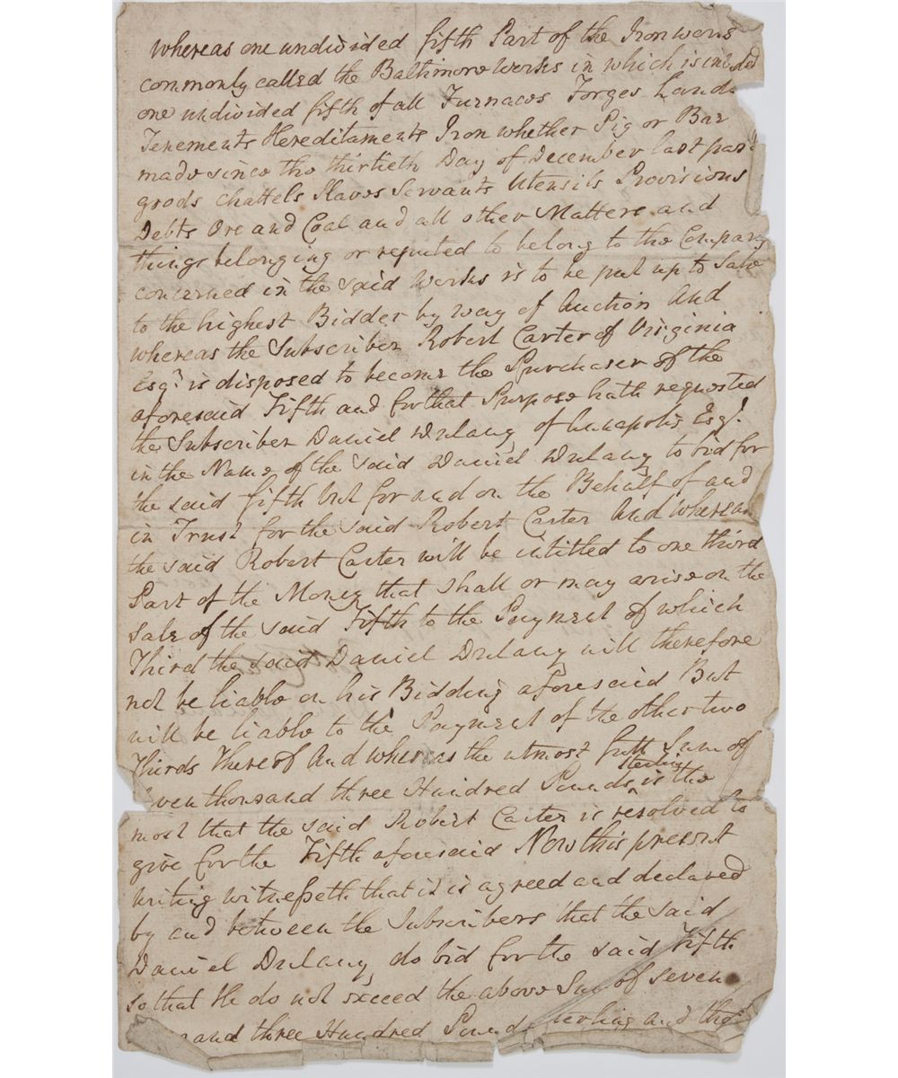 (1727/8 - 1804) Virginia planter and grandson of Robert "King" Carter of Corotoman. After a religious awakening in 1787, Carter rejected slavery and manumitted nearly 500 slaves from his plantation-the largest single release of slaves in North American history prior to the Civil War. Good association manuscript D.S. "Robt Carter," 2pp. legal folio, [Baltimore], Sept. 4, 1770 in which Carter purchases one-fifth of the "Baltimore Iron Works…" from DANIEL DULANY (1722 - 1797) of Annapolis for £100. The document is also signed by Dulany who also wrote the body of the contract. Interestingly enough, the Baltimore Iron Works depended chiefly on slave labor from its founding in 1733. Folds, some marginal losses affecting a few words of text, else good condition.