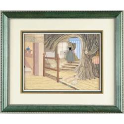“SLEEPING BEAUTY” PRODUCTION CEL. An original hand painted production cel of Sleeping Beauty as Briar Rose with Key Master background signed by Marc Davis, Ollie Johnson, and Frank Thomas (who were three of the famed "9 Old Men"). From Walt Disney’s 1959 production of Sleeping Beauty. Certificate of Authenticity from American Royal Arts Corp. Westbury, N.Y. SIZE: Image Size: 15 1/2” w. x 11 1/2” h. CONDITION: Near excellent; professionally framed. PF 1-3418 (4,000-6,000)