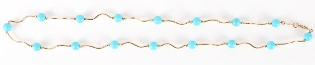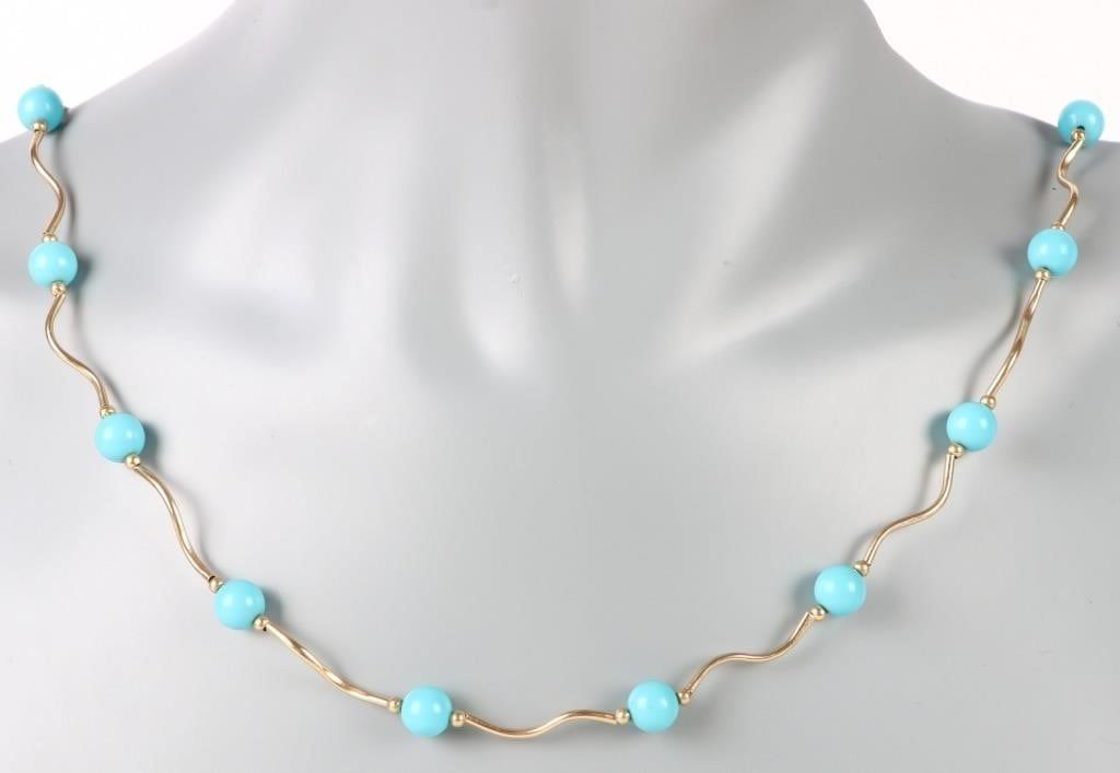 Sleeping beauty turquoise 14K yellow gold beaded choker necklace.