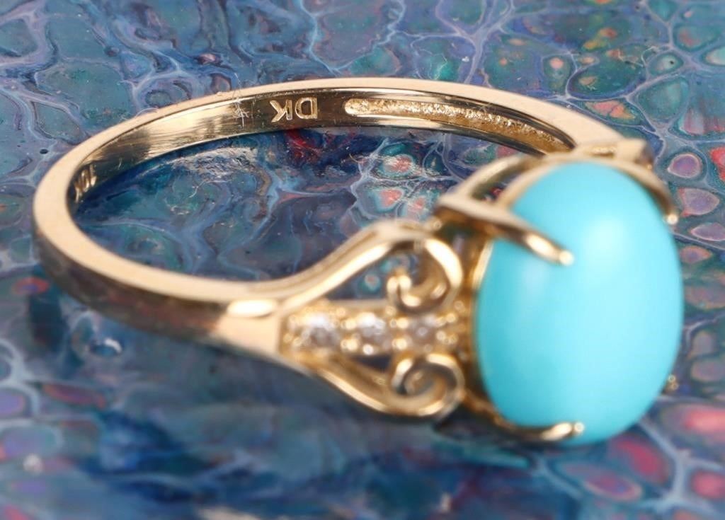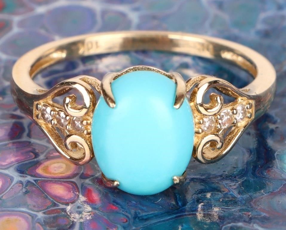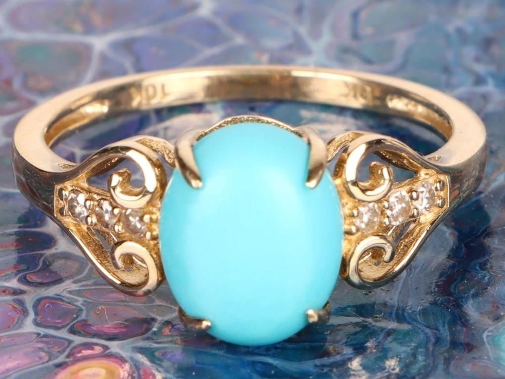 Sleeping beauty turquoise diamond 10K yellow gold ladies ring. Ring has six 0.02CT round diamonds.
