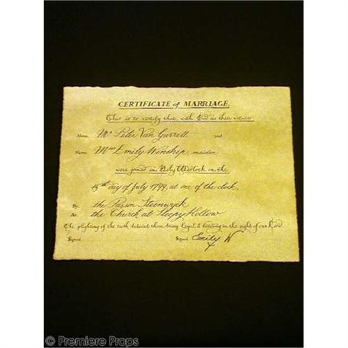 SLEEPY HOLLOW - This marriage certificate was signed by "Emily Winship" and measures approximately 9 3/4" by 7 3/8" in size. This document was forged on rough brown paper, features the names "Peter Van Garrett" and "Emily Winship," and has rough edges.
