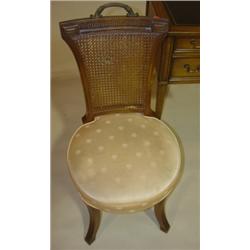 SLIGH-LOWRY WRITING DESK . Leather top. French provincial style. Wear and scratch marks to top. Marked on inside of middle drawer "Sligh-Lowry-Holland Michigan". Desk: 29.5" H, 46" W, 23" D. Chair has cane back and upholstered seat. Upholstery has slight staining.