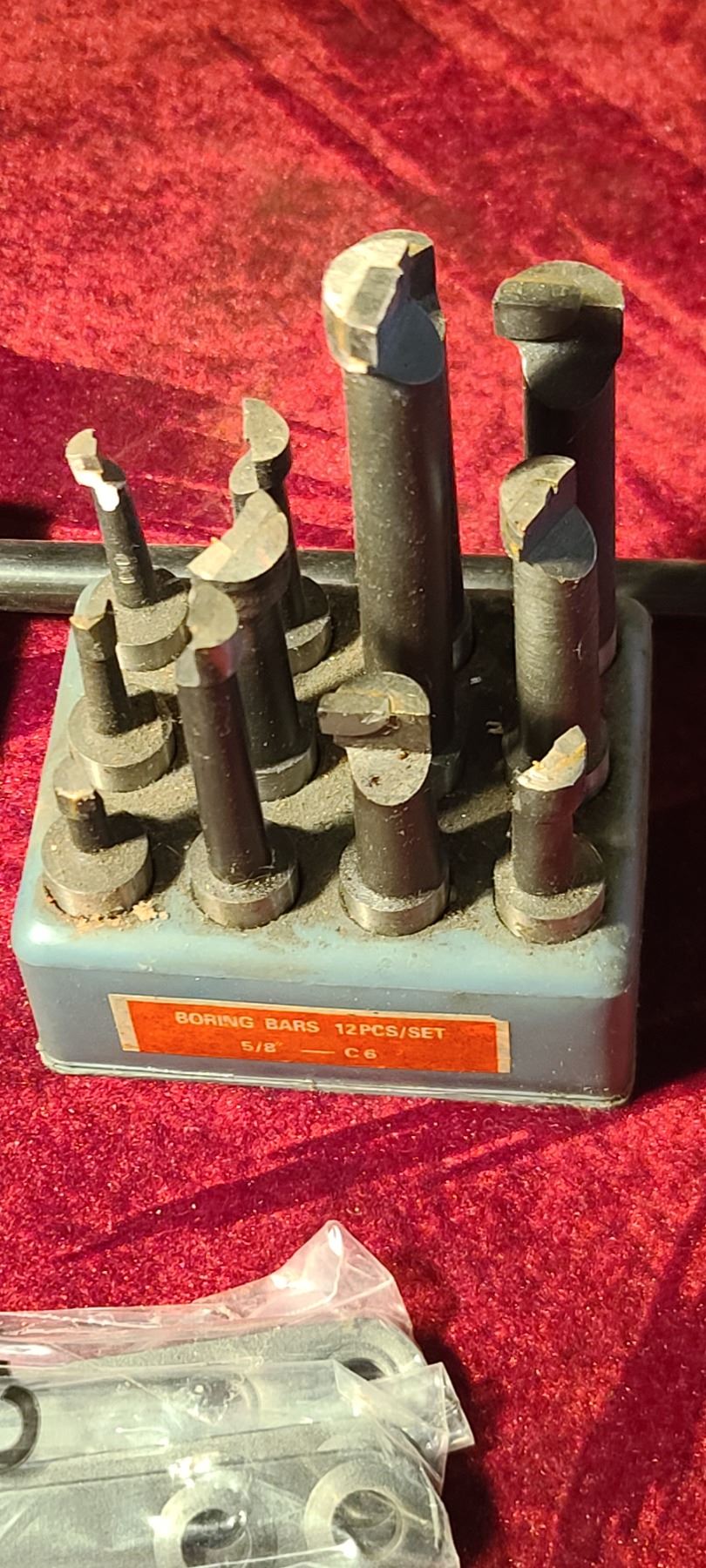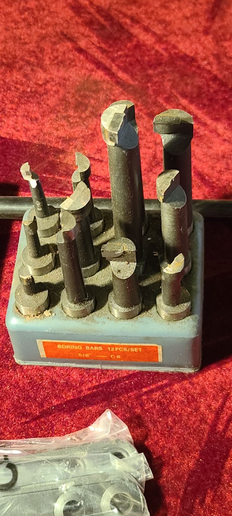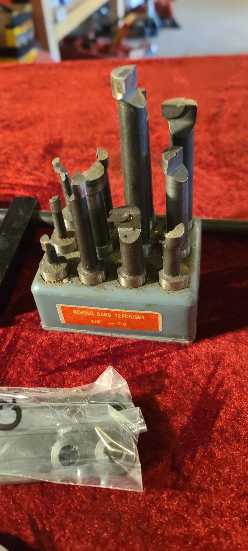 SLITTING SAW, FOUR DOG BONES, BORING BARS, TRAPANING TOOL, AND LATHE WRENCHES
