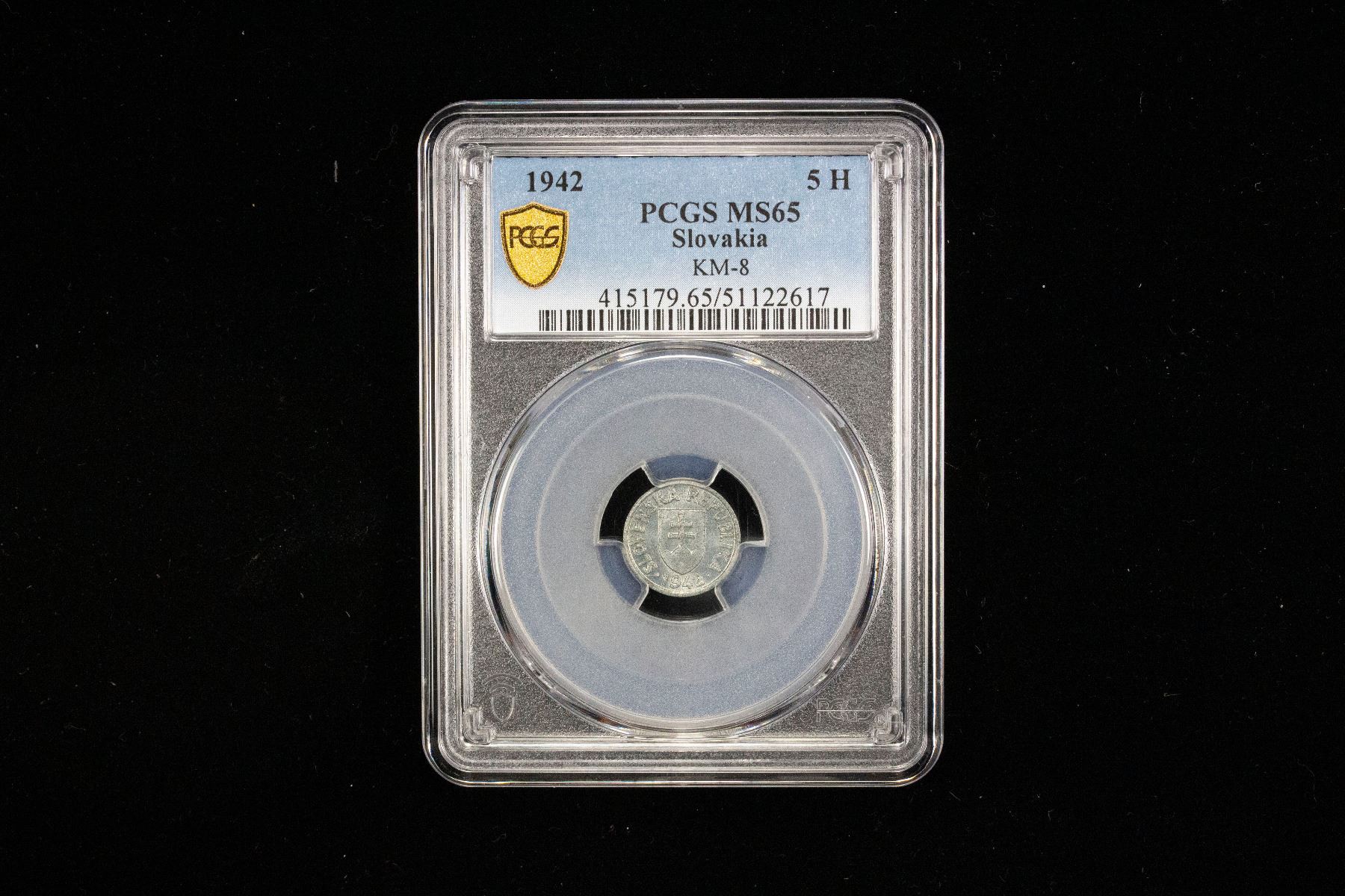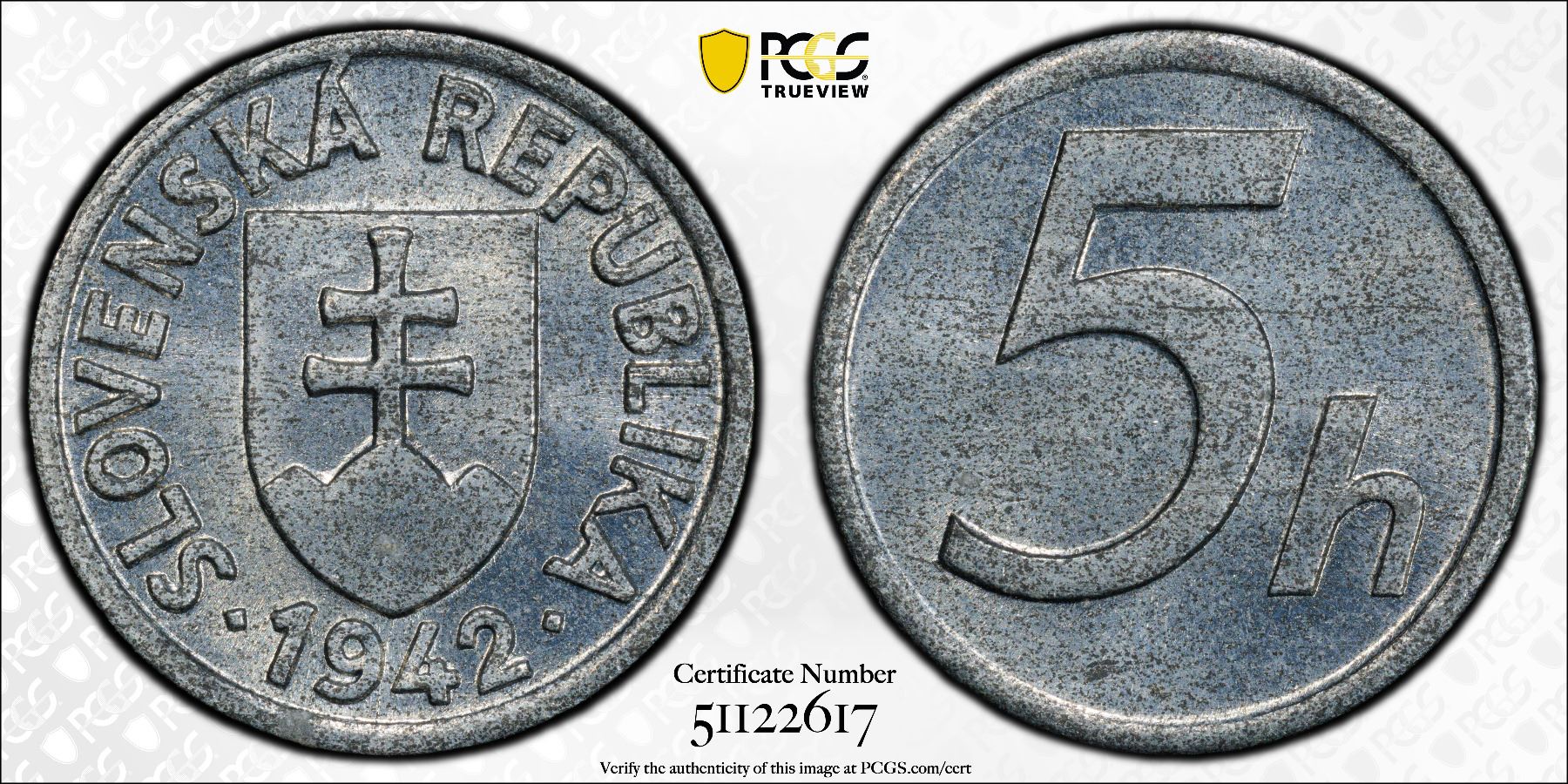 SLOVAKIA: Republic, 5 halierov, 1942, KM-8, struck in zinc, a superb quality example! PCGS graded MS65. The (First) Slovak Republic, otherwise known as the Slovak State, was a partially-recognized client state of Nazi Germany which existed between 14 March 1939 and 4 April 1945.