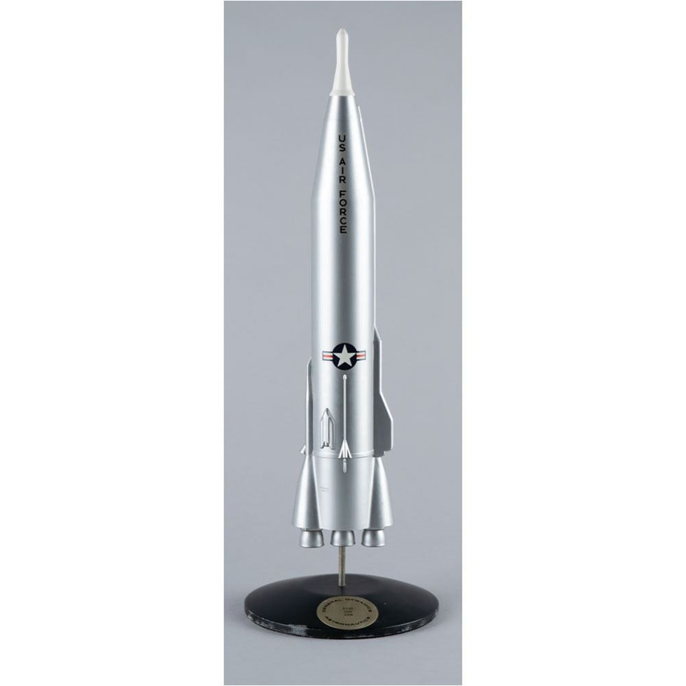 A General Dynamics contractor model of the SM-65 Atlas intercontinental ballistic missile developed for the United States Air Force by the Convair Division. The model stands 18è in height and is set on a metal 6è diameter base with plate that reads: ‰ÛÏGeneral Dynamics, Astronautics, Atlas, USAF, ICBM.‰Û Bottom of base bears a Topping Inc. label. In fine condition, with wear to back decals, and a small part to bottom, ostensibly an exhaust duct, detached but present; the base bears some scuffing to rim and edge.