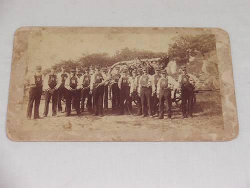SM. ALBUMIN PHOTOGRAPH OF 17 FIREMEN IN PARADE UNIFORMS IN FRONT OF HAND ENGINE S.H. #8 - E.J. DYER ANNISQUIM MA - WEAR and LOSSES;