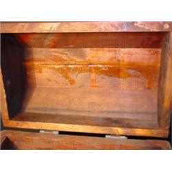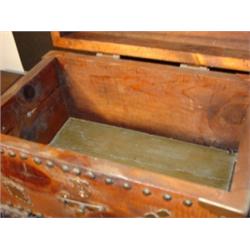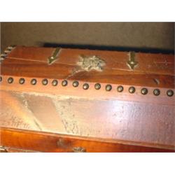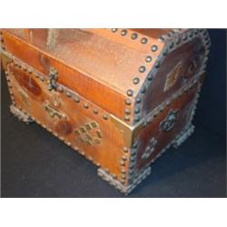 SMALL WALNUT ROLL TOP TRUNK. Decorated with tacks and brass. 12" H, 15" W, 9.5" D