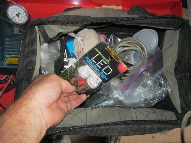 SMALL 12V AIR COMPRESSOR & BAG W/MISC. ITEMS