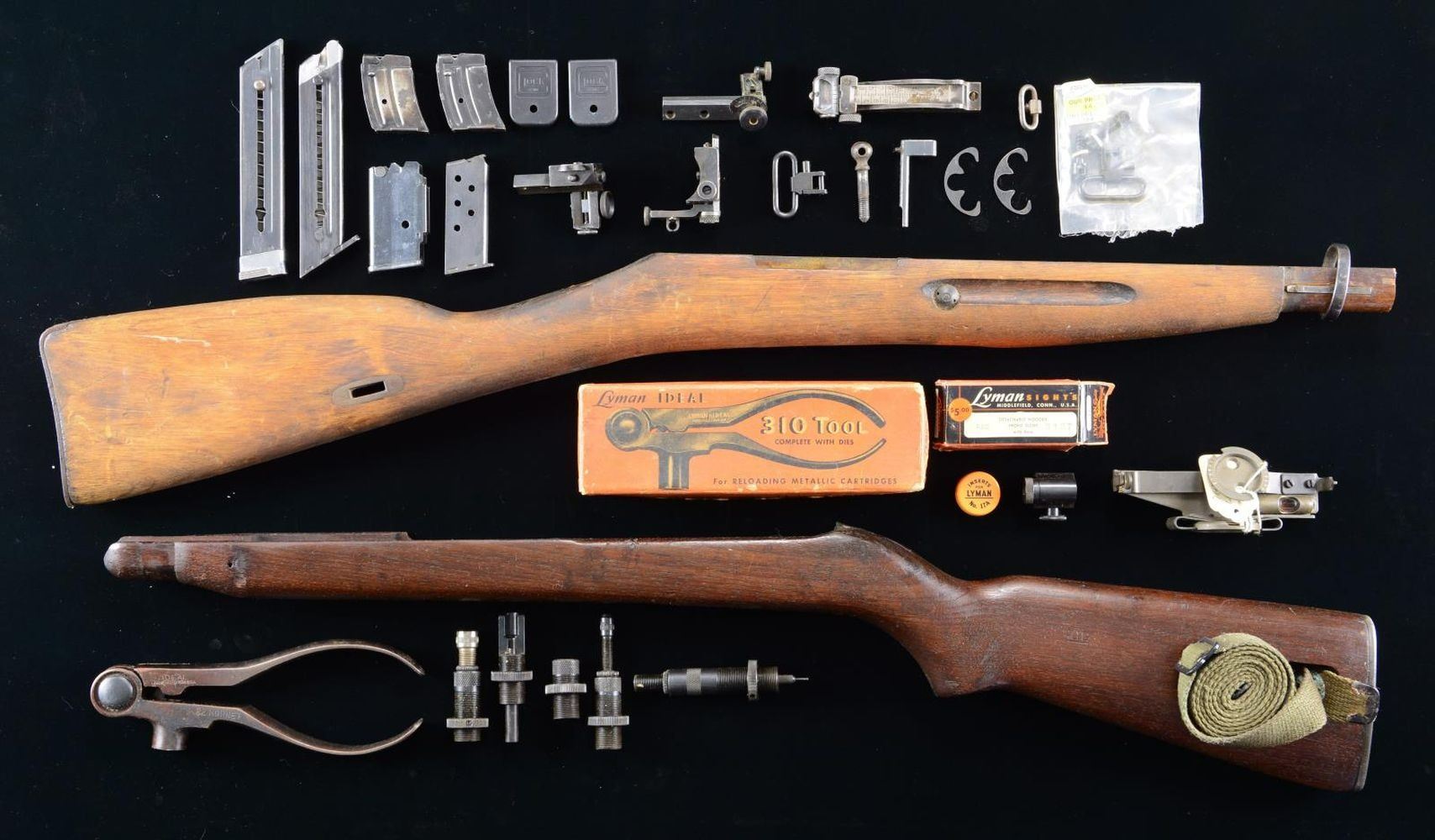 SIGHTS. STOCKS: 1 cutdown stock for 91/30 style rifle. Missing magazine assembly & buttplate shows heavy pitting. 1 Stock for M1 Carbine marked with boxed "SG" on right, boxed "OG" on left & yellow painted rack number "36" on grip. Comes with green sling. Stock has very good finish with cracking of wood at top of wrist behind plate. MAGAZINES: 2 Winchester Model 67, 22 LR, 5 rd. mags. 1 Colt Woodsman two tone, 22 LR, 10 rd. mag. 1 Early Ruger Standard Auto, 22 LR, 9 rd. mag. with slot for button on right side only. 1 Colt 1908 Vest Pocket, 25 ACP, 6 rd. mag. 1 Mossberg, 22 S, L, LR, 6 rd. mag. SIGHTS: 1 Springfield 1902 Krag rear sight with sliding peep aperture. 1 Unmarked receiver sight appearing Redfield without aperture disk. 1 Lyman 57A reciver sight. 1 Mossberg style receiver sight. 1 Unmarked receiver sight similar to Mossberg. 1 M15 Grenade Launcher sight for M1 rifle. 1 Lyman Reg. 513T Detachable hood front sight #77. RELOADING: 1 Lyman No. 310 22 Hornet reloading tool with box & complete kit. CONDITION: balance good to very good with some examples showing oxidation & wear. (02-21250-2/MD). $200-300.