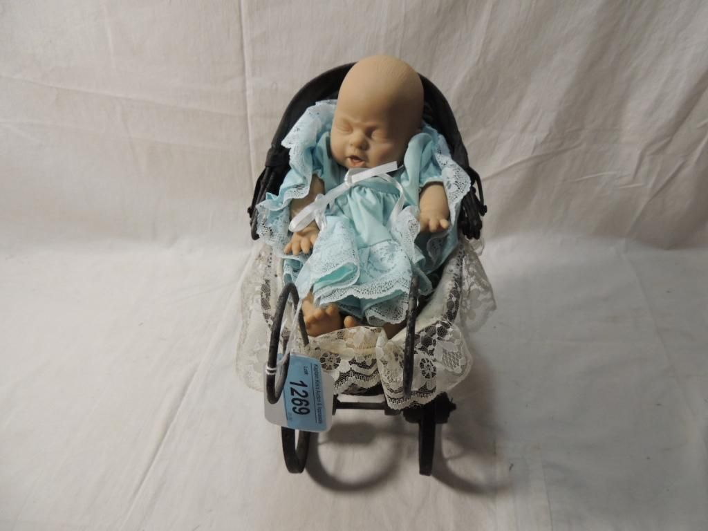 ANTIQUE STYLE WOODEN METAL AND WHICKER CARRIAGE LIGHT BLUE DRESS. LACE DETAILS. AS SHOWN. SEE PHOTO FOR MORE DETAILS.