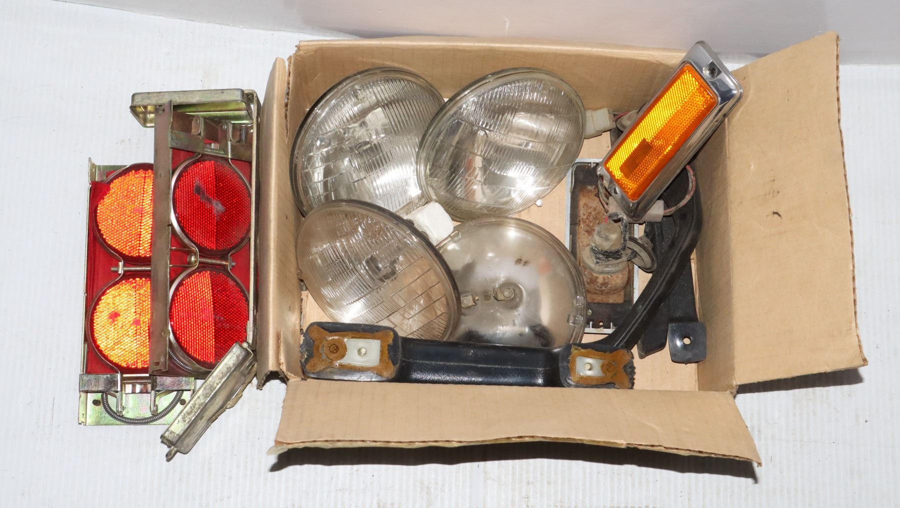 SMALL BOX OF VINTAGE AUTOMOTIVE ITEMS, LIGHTBULBS
