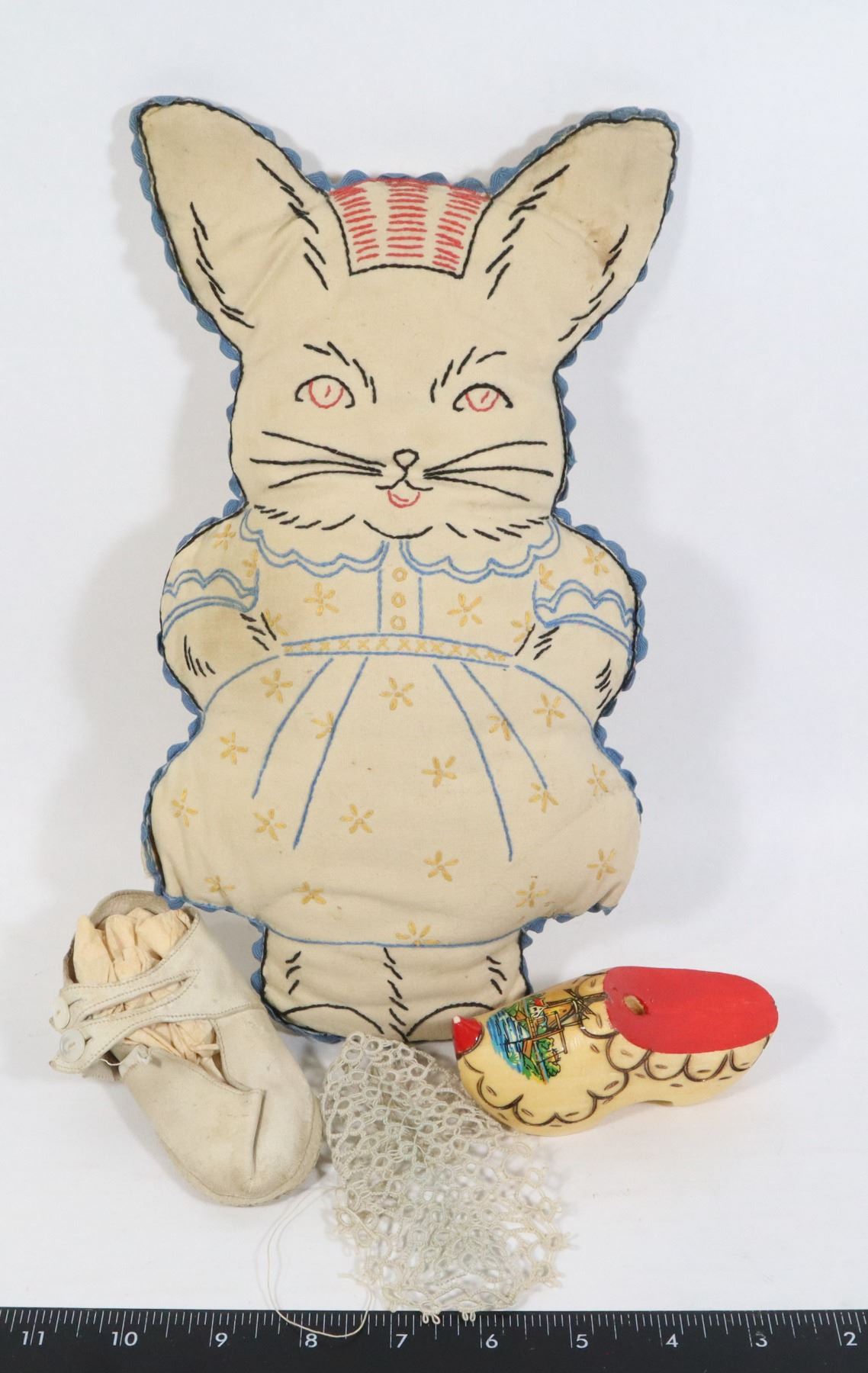 HOME MADE RABBIT DOLL, BABY SHOE, AND MORE