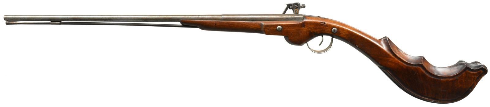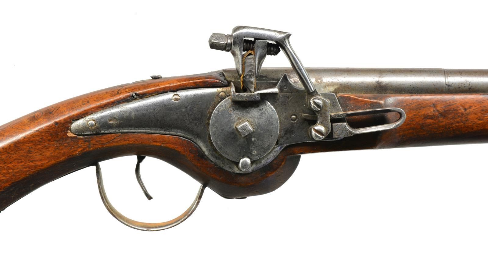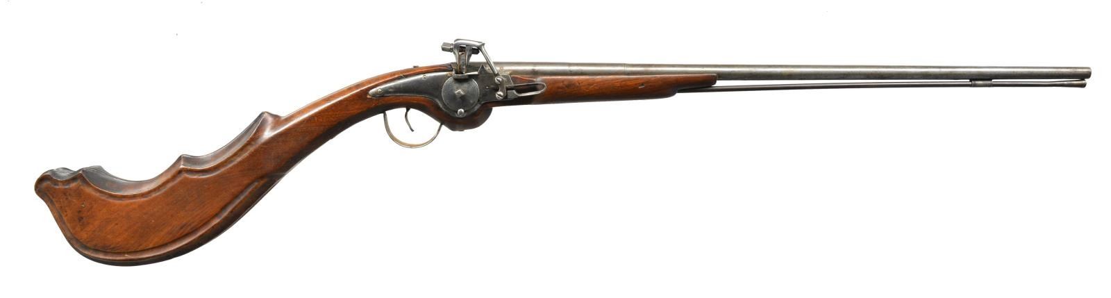 Cal. 44. S# 5F. Bbl. 26 1/2” tapered rnd. engraved “5F” at rear. Small sized Wheelock w/ sliding hand cover & nicely filed dog marked “IT” on the interior. (There is an IT (name unknown) working in Suhl ca 1680). Much newer walnut stock has long swan neck into butt & attaches to bbl. w/ single pin & screw at tang. Stock is chamfered & butt is deeply fluted w/ incised carved channels. Steel ramrod is held by a single pipe. CONDITION: fair to good, all metal parts cleaned to silver over considerable pitting & w/ subsequent darkening. Stock retains most of what appears to be its original finish & is rather crudely made. Lock appears to be intact but was not tested for functioning. Dark pitted bore. (01-17210/MGM139). ANTIQUE. $2,500-4,000.