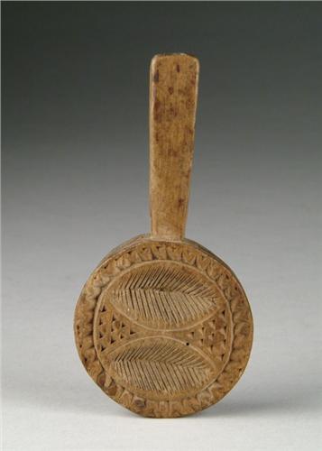 SMALL CARVED WOOD LOLLIPOP BUTTER PRINT. One sided having two leaves and chipped carved center with zigzag carved border. SIZE: 2-1/4in. dia x 4-3/4in. l. CONDITION: Very good. 9-25356
