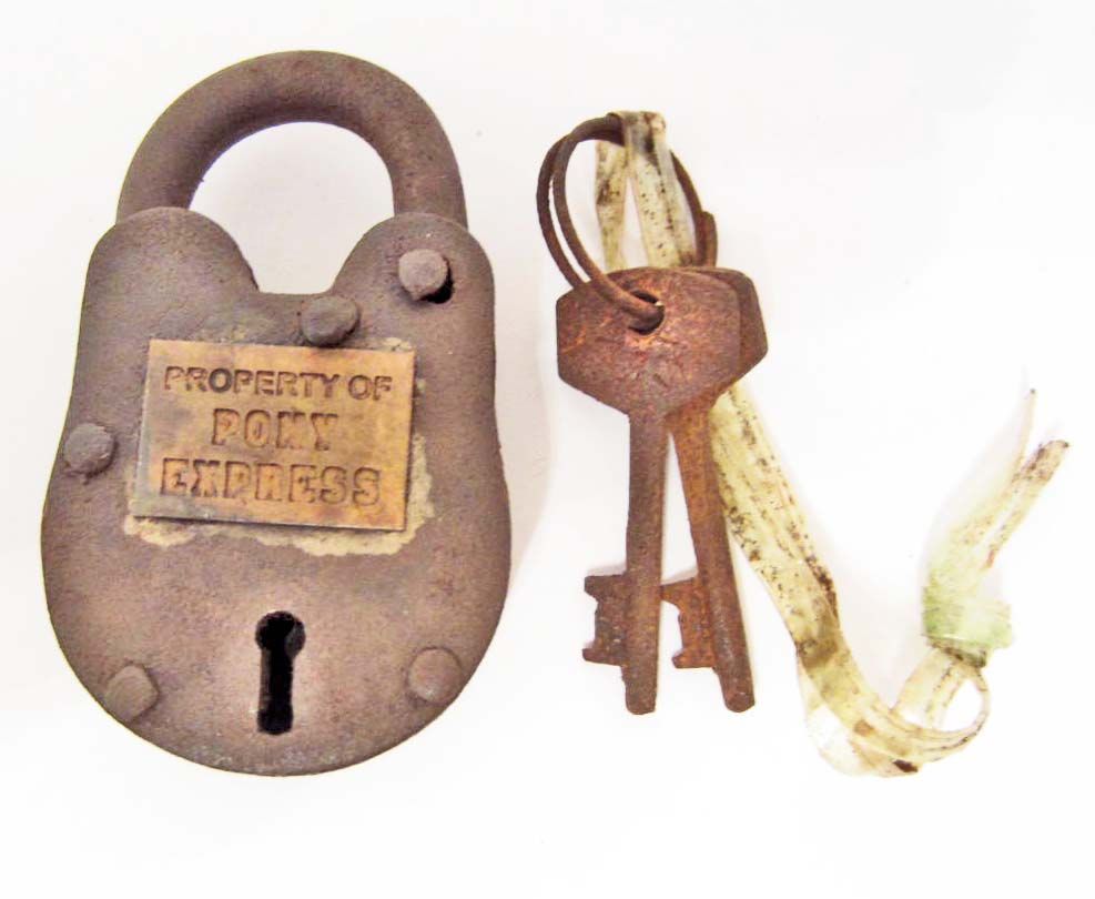 SMALL CAST IRON LOCK WITH PONY EXPRESS TAG & KEYS