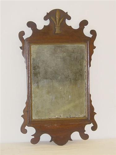 SMALL CHIPPENDALE MIRROR - MAHOGANY W/ PARCEL GILT INNER LINER & CREST W/ PARCEL GILT PLASTER PRINCE OF WALES FEATHERS-W/ OLD GLASS, BACK MARKED CAPT. COGSHALL (21 3/4" T X 12 3/4" W) - REPAIRS, REPLACEMENTS, IMPERFECTIONS