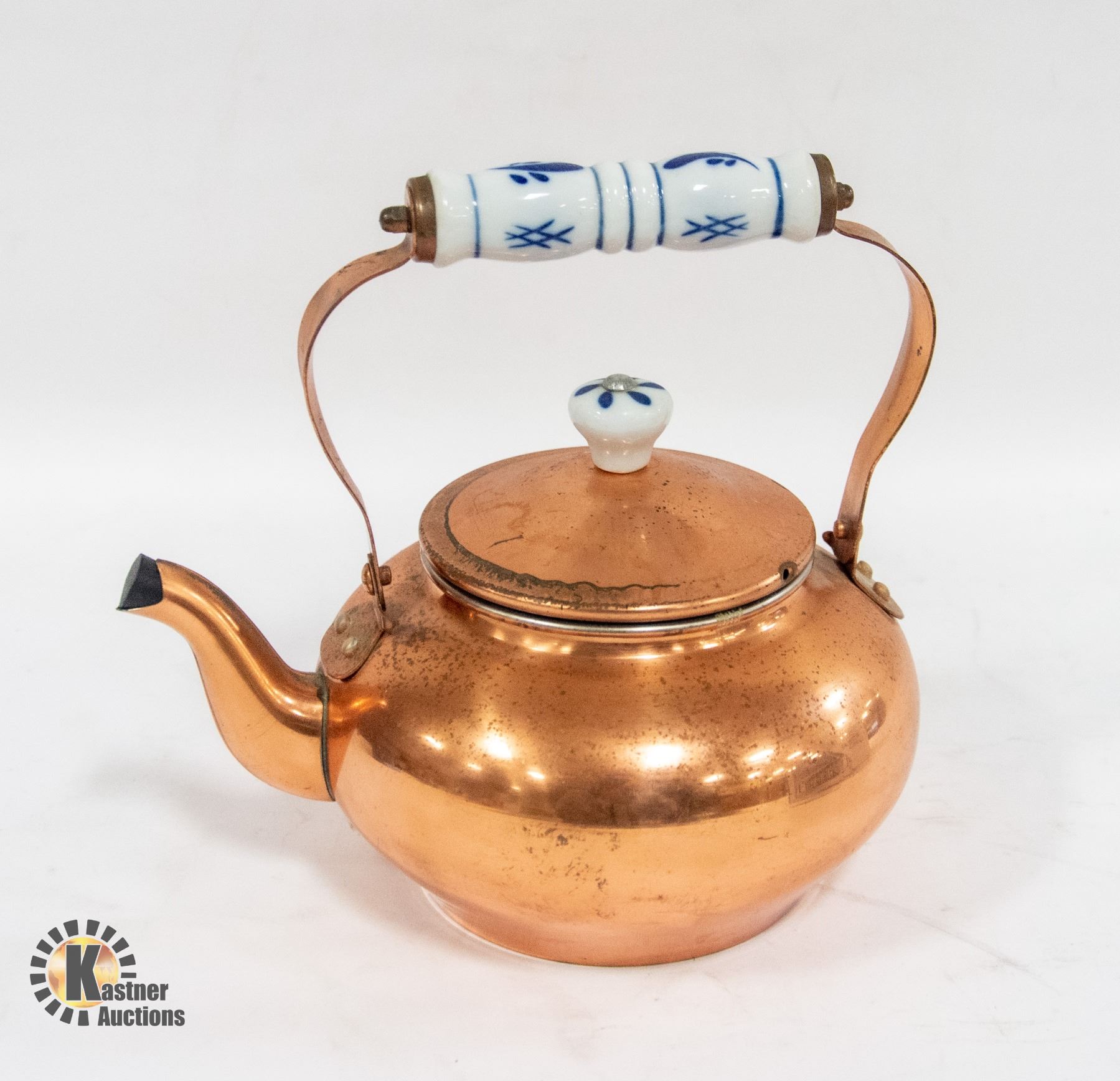 SMALL COPPER TEA KETTLE (BLUE HANDLE).