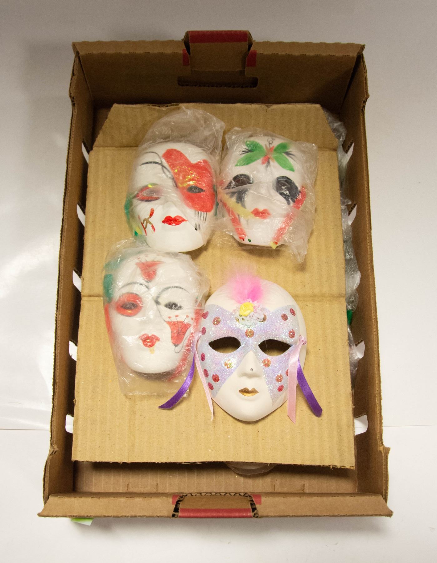 LOT OF 13 SMALL DECORATIVE CERAMIC PAINTED FACE MASKS, 3 X 4 " IN SIZE