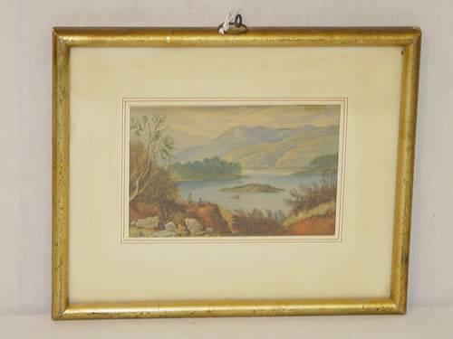 SMALL EARLY 20TH CENT. ENGLISH WATERCOLOR OF RURAL MOUNTAIN LAKE LANDSCAPE, UNSIGNED & MATTED IN LEMON GOLD FRAME (4 1/4" X 6 1/2");