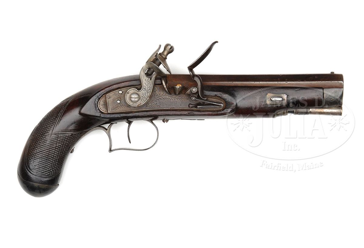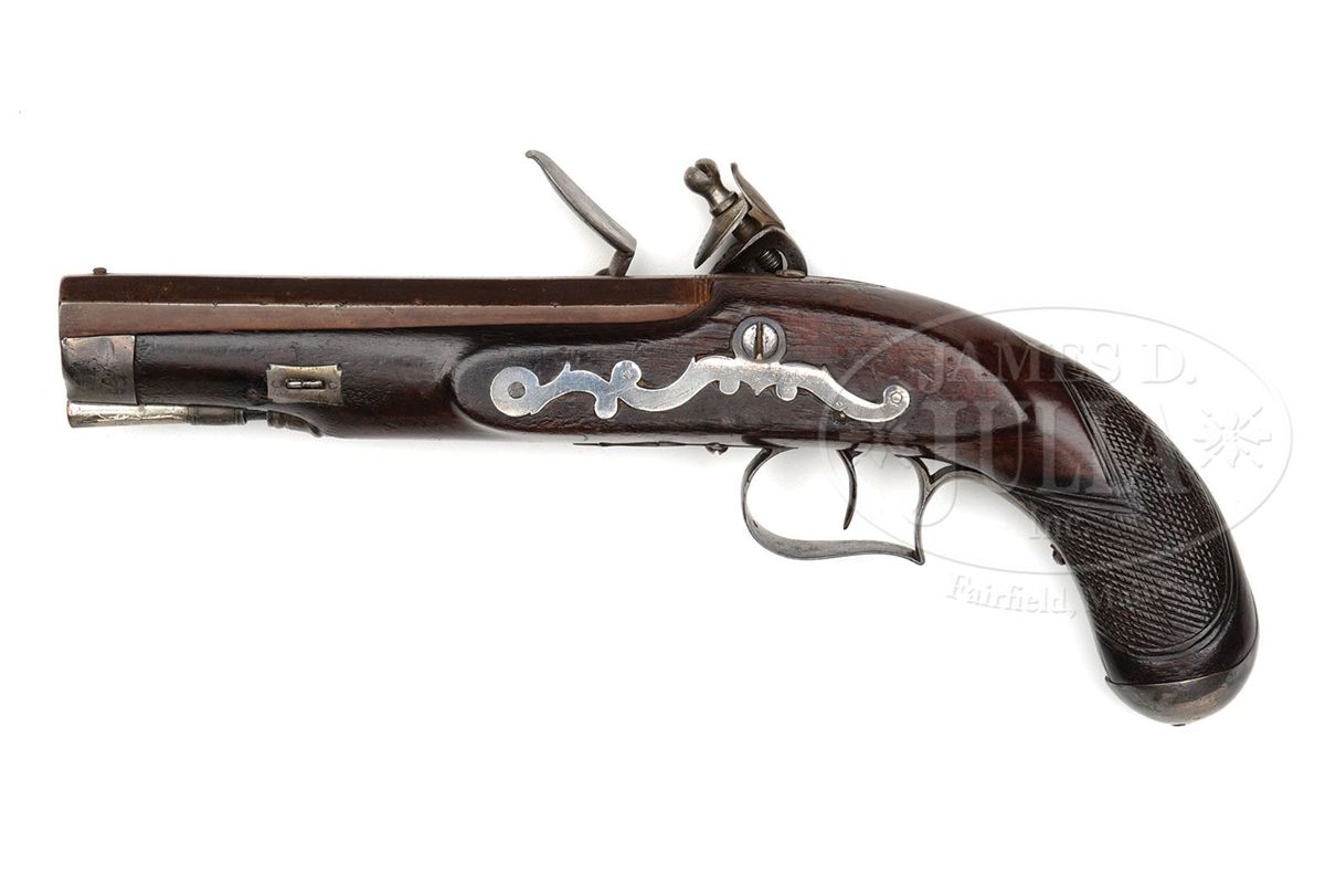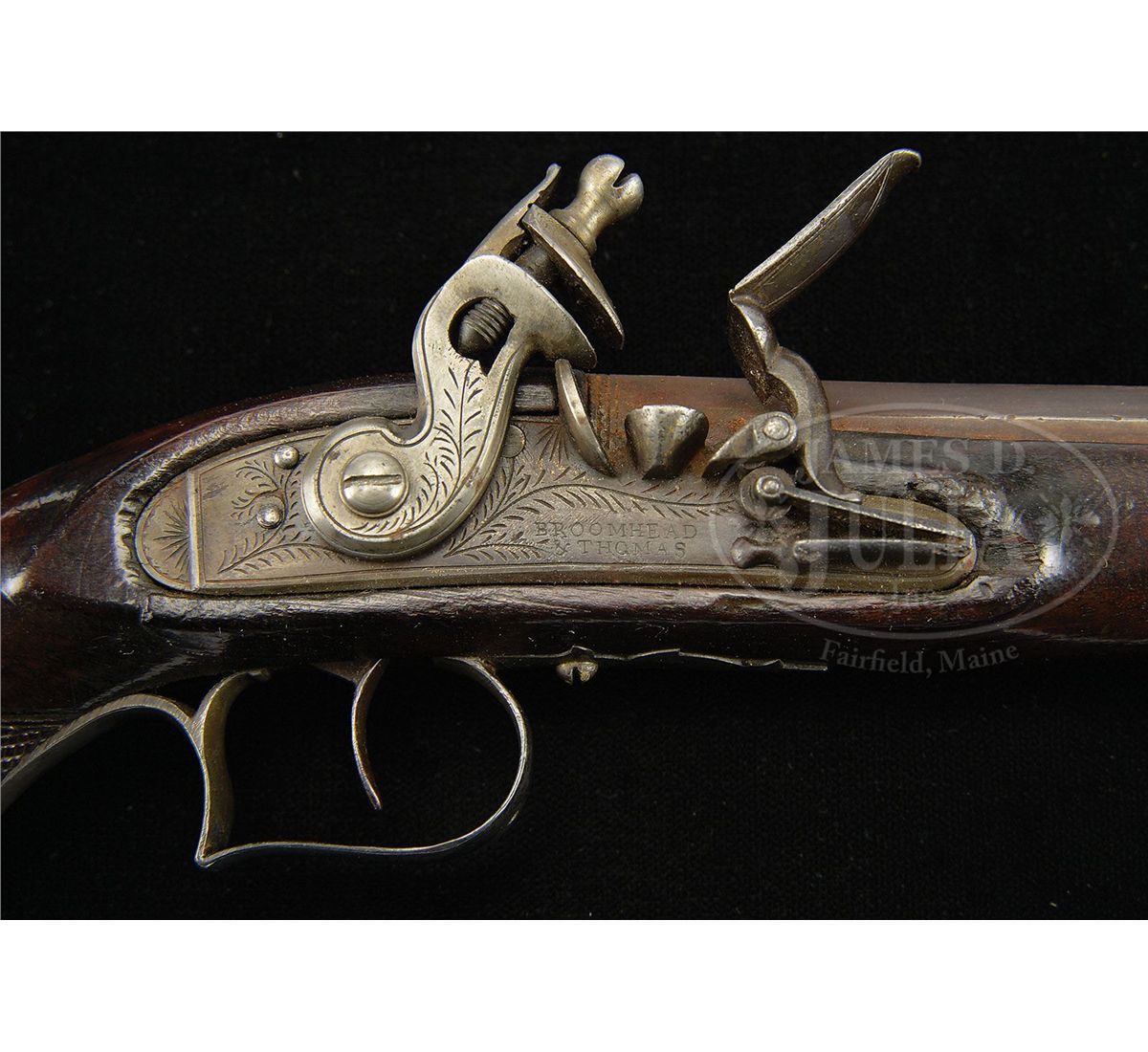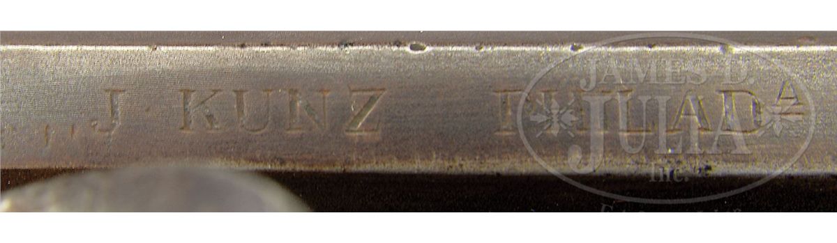 NSN. 5-1/2" full oct rifled .58 Cal bbl engraved "J KUNZ PHILADa". Bbl tang is engraved and orig flintlock is marked "BROOMHEAD & THOMAS". Pistol has a pewter nosecap and bbl is held to stock with one bbl wedge. Pistol grip is checkered and stock is walnut. Pistol has 3-1/2" long nicely figured 1-screw sideplate. Iron trigger guard, buttcap and ramrod ferrules retain some of their orig blueing. PROVENANCE: Frank Sujansky Collection. CONDITION: Small crack from rear of lock toward trigger guard and some rough spots around lock mortice. Pistol seems to be in orig condition throughout with only normal age imperfections. 4-49494 RG32