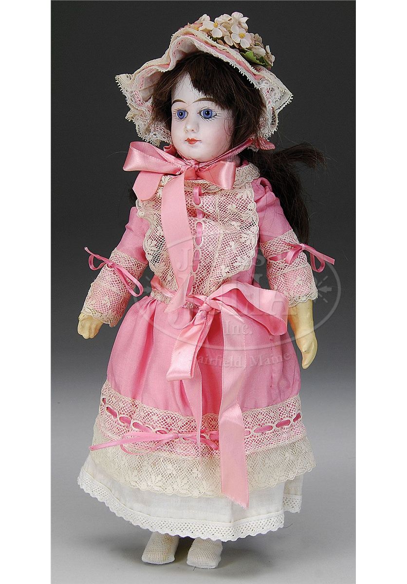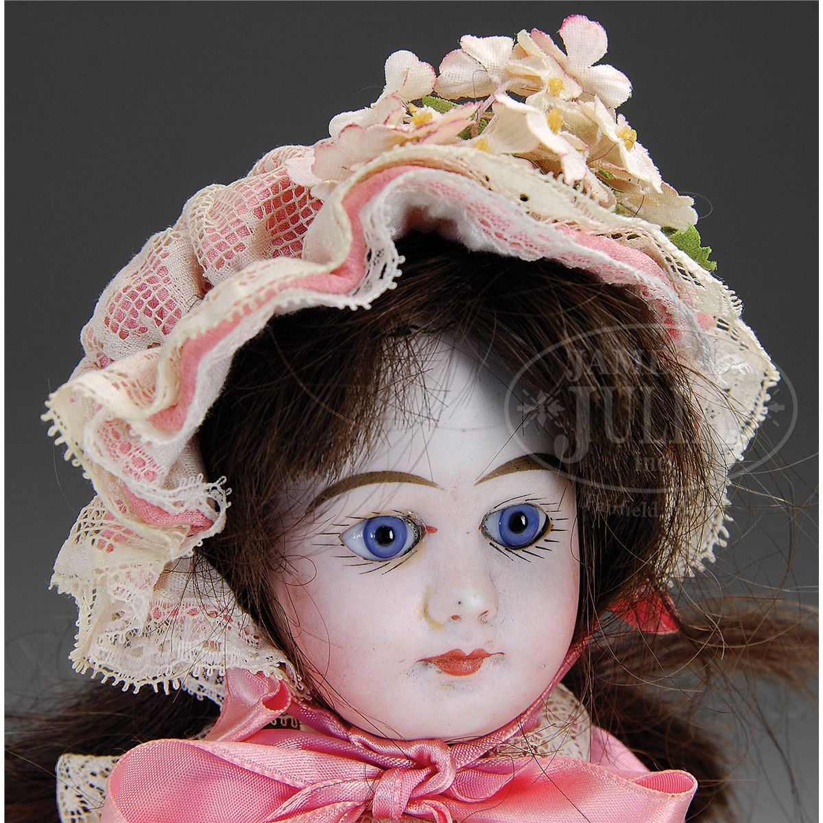 Bisque socket head incised "EDEN BEBE 6 PARIS", with inset blue glass eyes, closed mouth with slight smile, one stroke eyebrows, mounted on a French composition five piece body, with joints at shoulder and hips. She has been redressed in 1890s style pink silk and lace dress and wears an old black human hair wig and French bonnet, well coordinated with the dress. SIZE: 13-1/2" (34cm). CONDITION: Some splits in composition of the body; black speck on side of nose, and old faint hairline running from right side of forehead down the cheek and under the chin. 1-12645