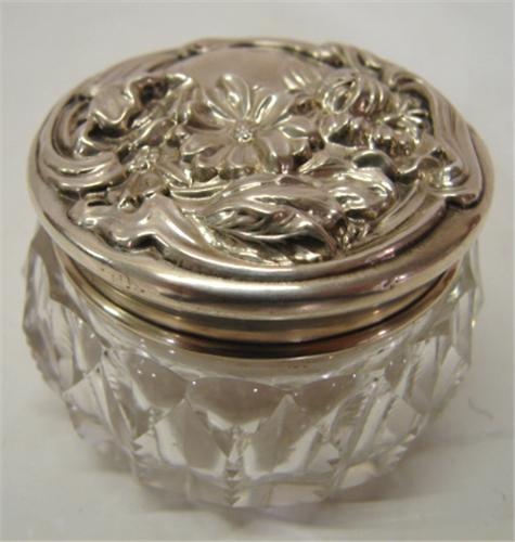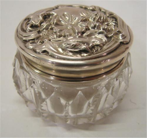 SMALL GLASS POWDER JAR WITH STERLING LID. Lid is marked “Sterling” and decorated with floral decoration. 1.5” H, 2” Dia.