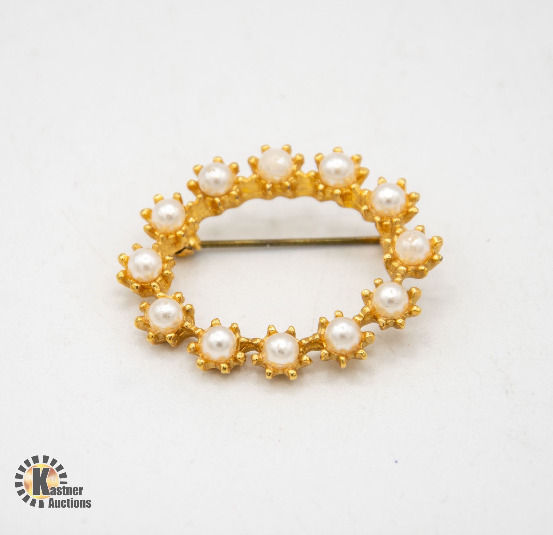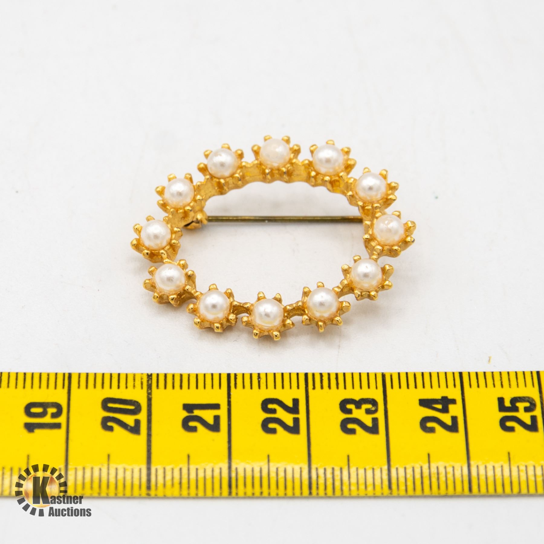 SMALL GOLD TONE OVAL RING BROOCH W/ PEARL BEADS