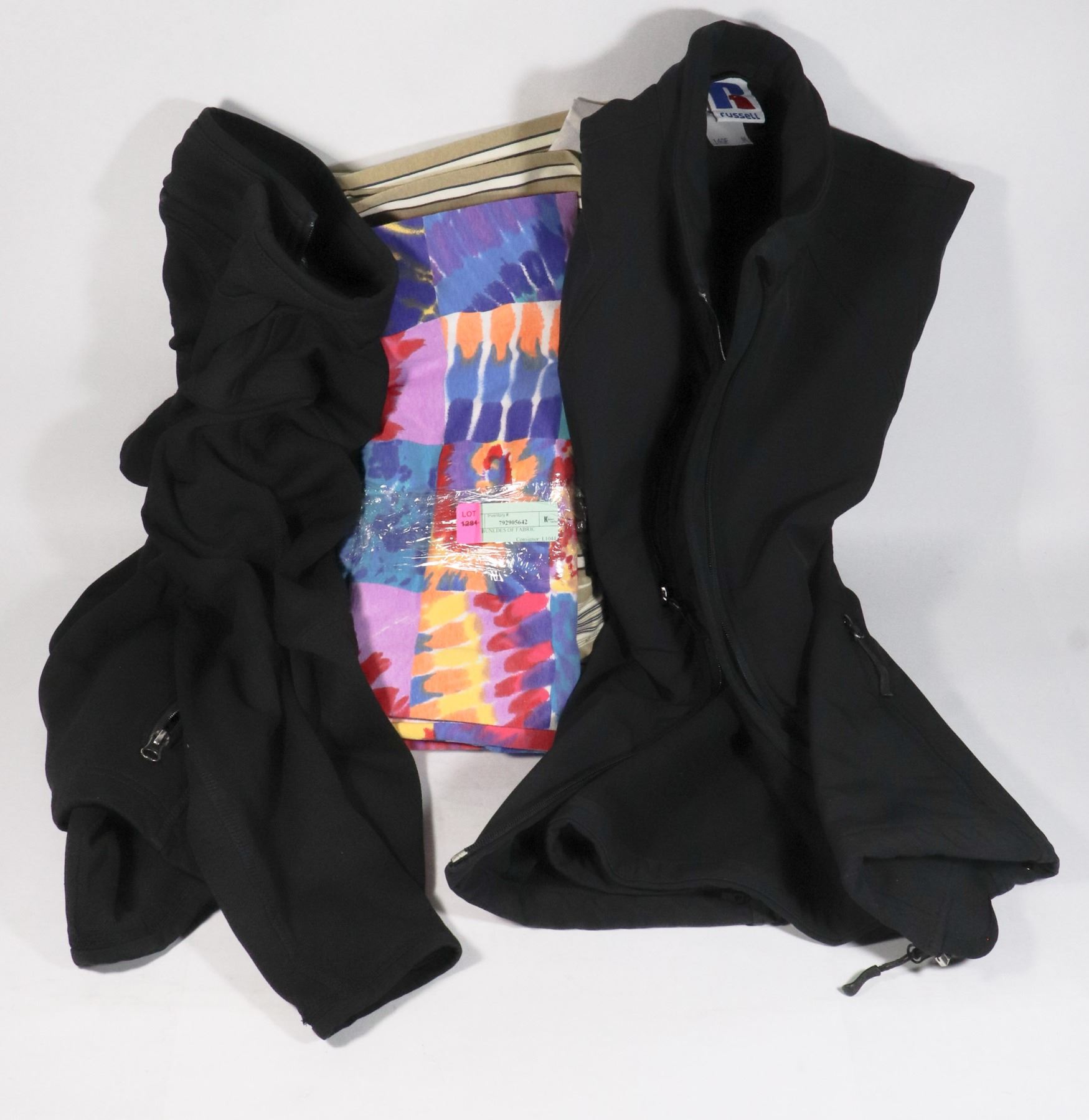 AND 2 BUNDLES OF FABRIC. ONE JACKET IS A MEDIUM. THE OTHER VEST IS XXL