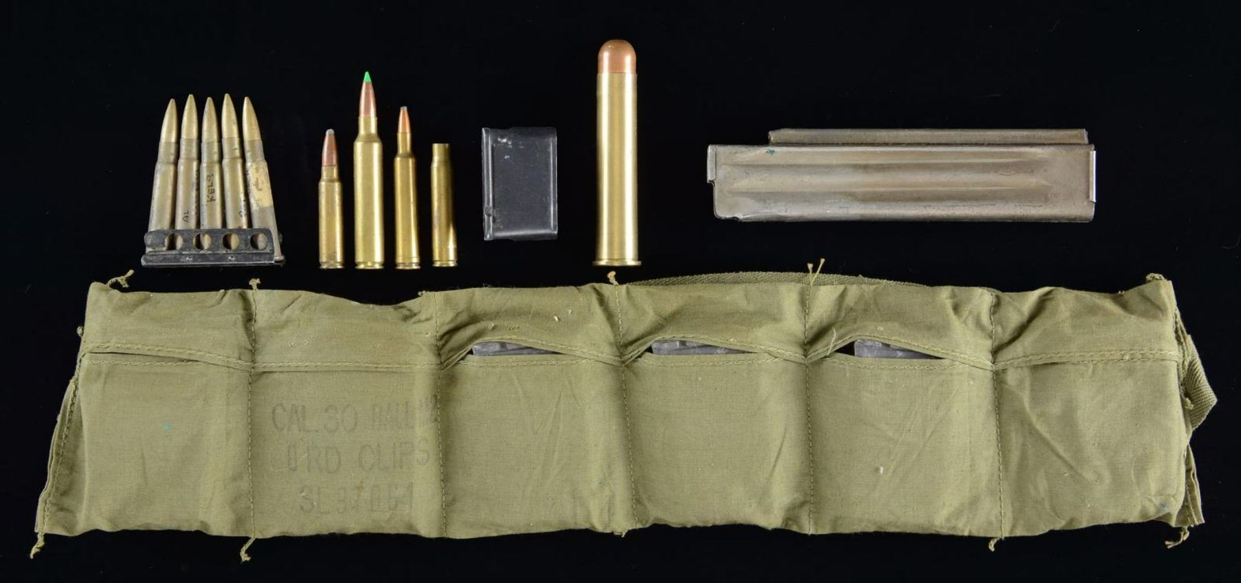 30-06: 48 RDS. of St. Louis M2 Ball with M1 Garand clips & bandolier. / 1 H&R Reising Model 50, 20 rd. mag. / 5 Rds. of 303 British; each has black marker writing. / 1 Matheson 470 NE rd. / CONDITION: mag. in good condition. 470 cartridge very good; most ammo good condition with patina; appears serviceable. PROVENANCE: from The Estate Collection of Thomas J. Mulligan. (02-19738-6/MD). $50-100.