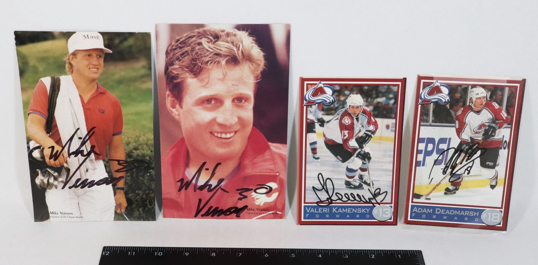 AUTOGRAPHED PHOTOS OF MIKE VERNON CALGARY FLAMES (UNAUTHENTICATED) AUTOGRAPHED PLAYER CARD OF VALERI KAMENSKY (UNAUTHENTICATED) AND MORE