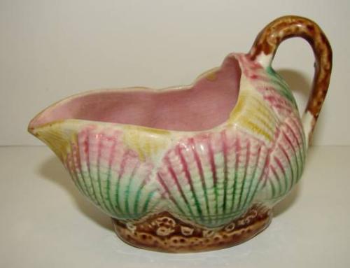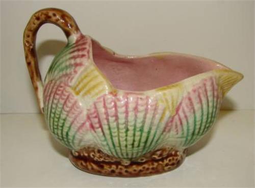 SMALL MAJOLICA CREAMER. Relief shell decoration on body. Shows crazing throughout. Unmarked. 3.25" H