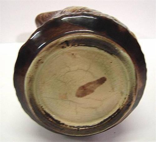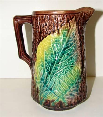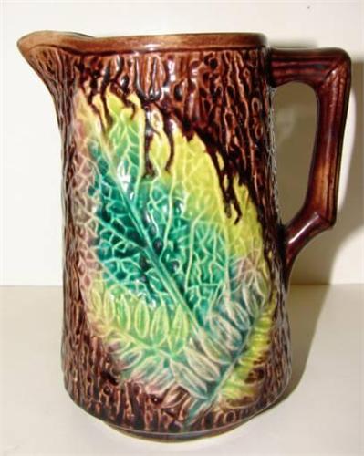 SMALL MAJOLICA WATER PITCHER. Relief tree bark decoration on body with relief leaf decoration. Unmakred. Shows crazing throughout with a few small tight spider lines at bottom. 5.5" H