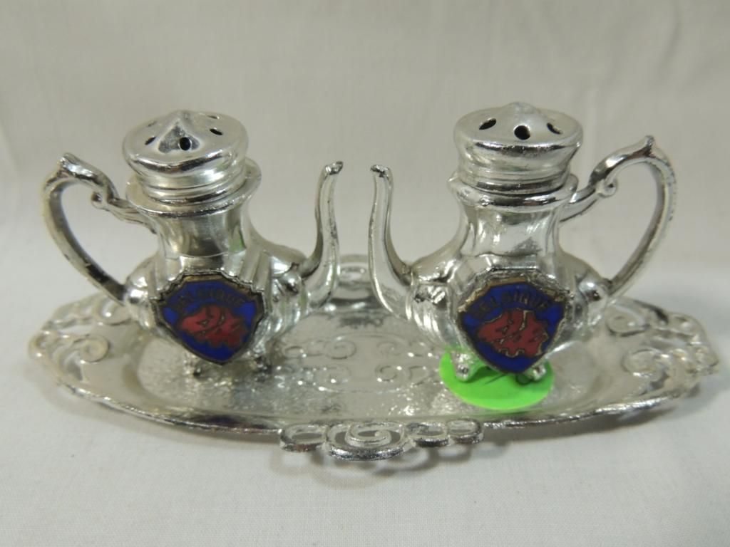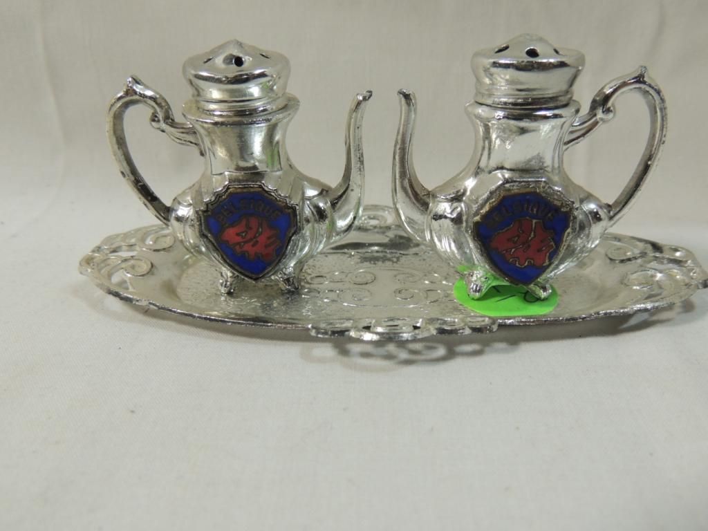 SMALL METAL TEAPOT SALT AND PEPPER SHAKERS. BELGIQUE. AS SHOWN SEE PHOTO FOR MORE DETAILS.