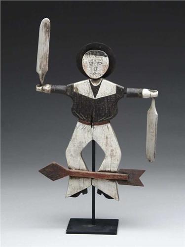 SMALL NANTUCKET PAINTED AND WOOD SAILOR WHIRLIGIG. Flat wood whirligig is a man with painted sailor outfit in black and white. His bevel back head has a metal and wood hat. His arms are outstretched and carry white single paddles. An arrow is going right to left at ankles and is painted red with a metal fin. SIZE: Sailor is 13” h; paddles are 5-1/2” x 9-1/2” w. CONDITION: Very good. 9-27508