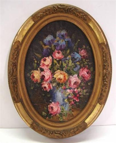 SMALL OIL ON BOARD FLORAL STILL LIFE PAINTING. Signed on lower right “M.P.” Painting rests in small oval gilt wood frame. 6.75” x 8.75” framed