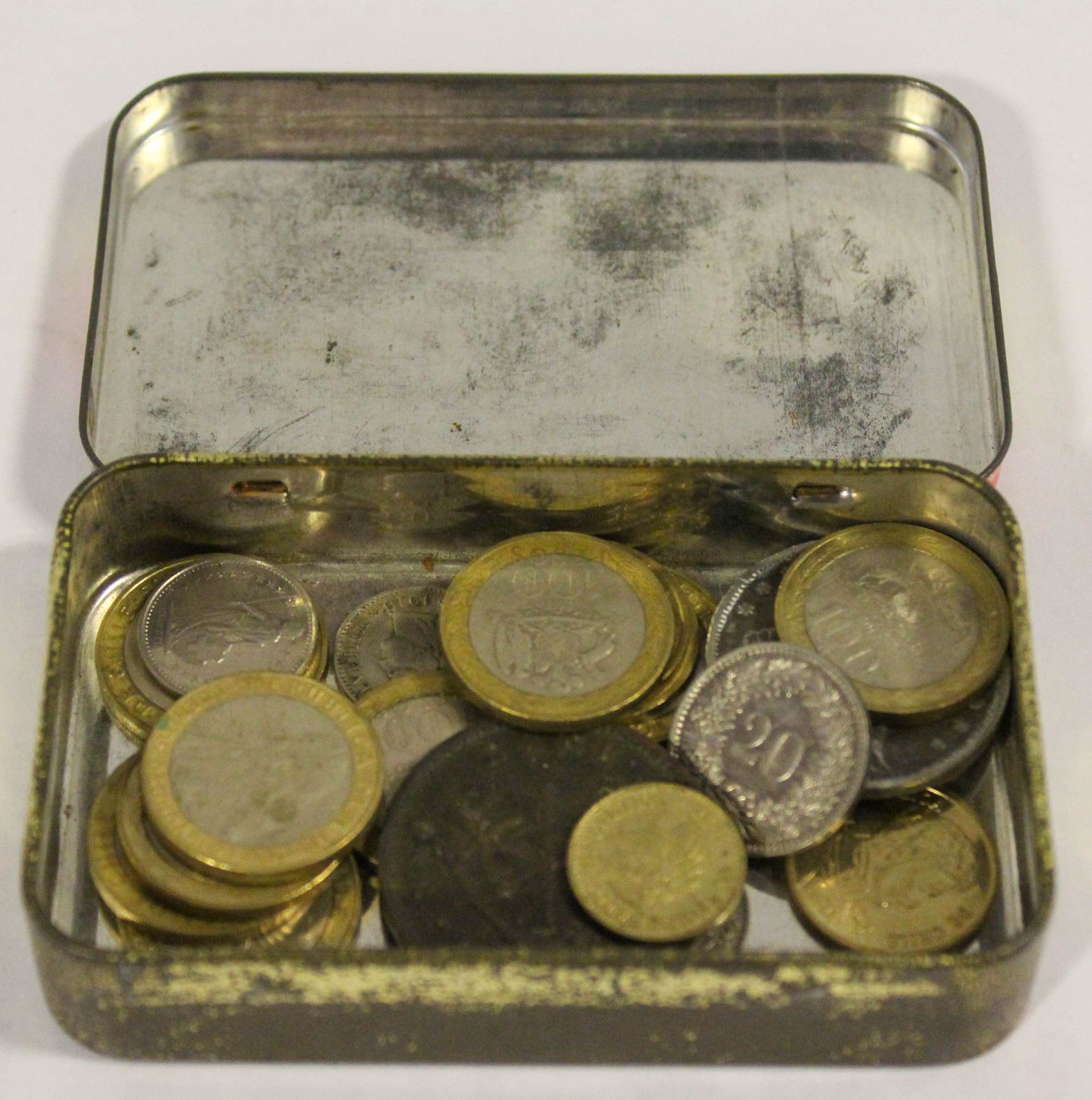 SMALL OLD TIN WITH ESTATE WORLD COINS