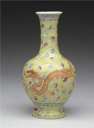 SMALL ORIENTAL BUD VASE. Yellow ground supports two orange dragons with colorful flower decoration. Turquoise inside and base having a square chop with four characters. SIZE: 6-1/4” h. CONDITION: Very good. 9-27595