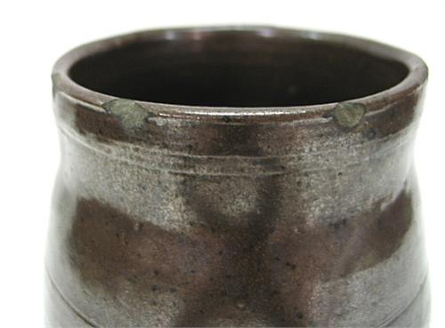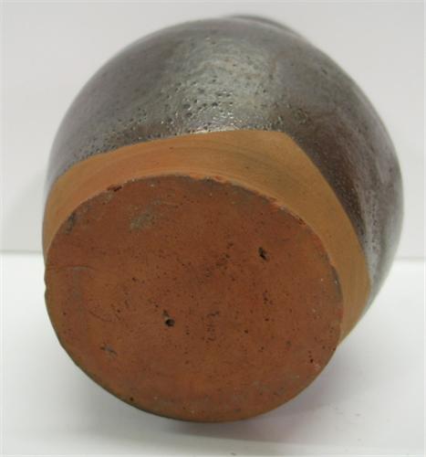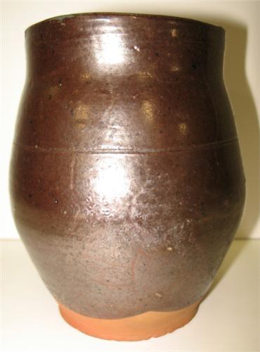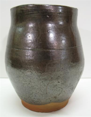 SMALL OVOID REDWARE CROCK. Has two incised horizontal lines around body. Shows a series of small chips along top outer rim. 5.5" H