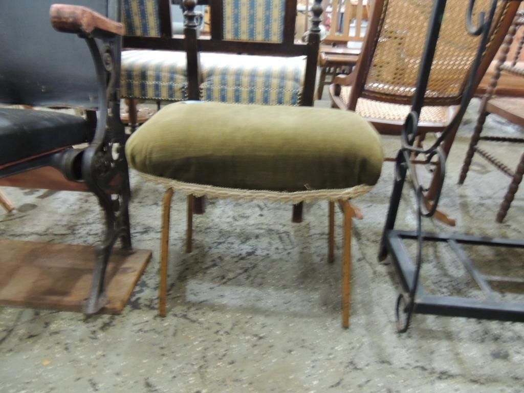 SMALL PADDED OLIVE GREEN FOOT STOOL AS SHOWN. SEE PHOTO FOR MORE DETAILS.