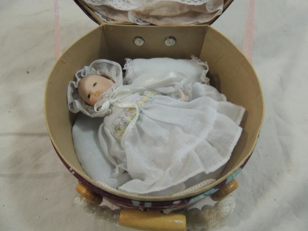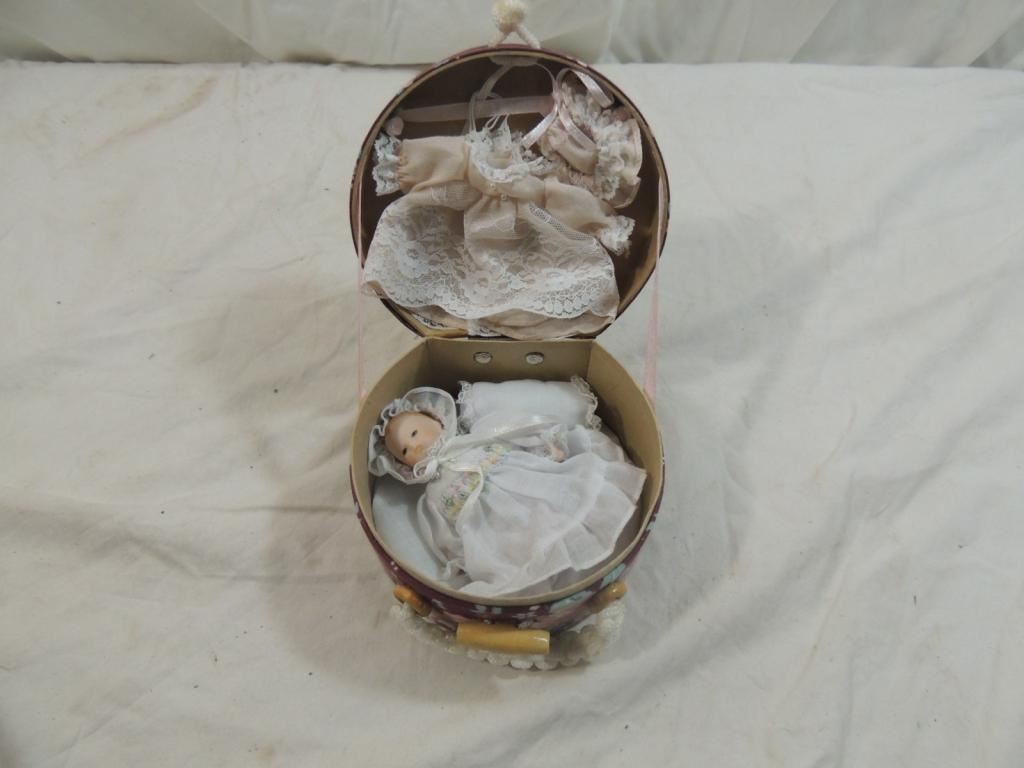 DECORATIVE BABY IN BOX, PORCELAIN BABY, LACE DRESS, DECORATIVE BABY DOLL, IN COLLECIBLE BOX AS SHWON SEE PHOTO FOR MORE DETAILS.