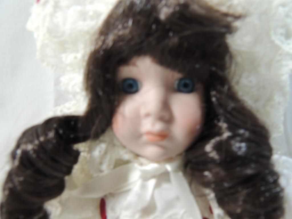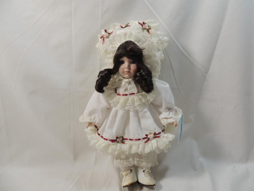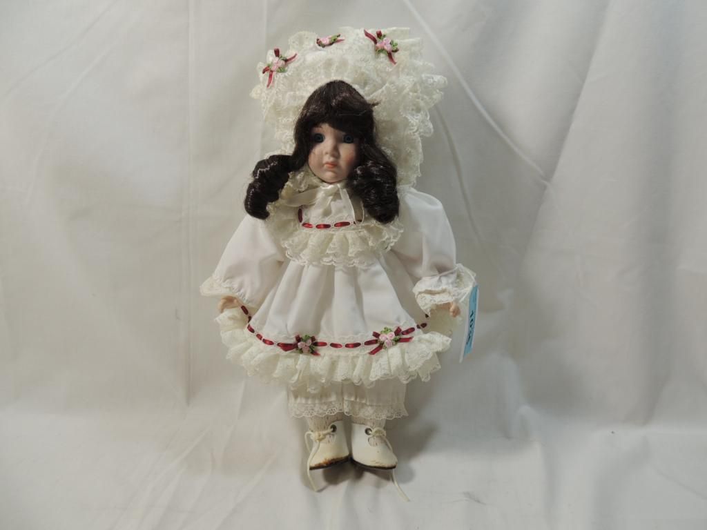 14" TALL PORCELAIN DOLL IN WHITE DRESS. AS SHOWN. SEE PHOTO FOR MORE DETAILS.