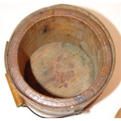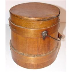 Small primitive firkin with handle and removeable lid. Bail swing handle. 6.5" H