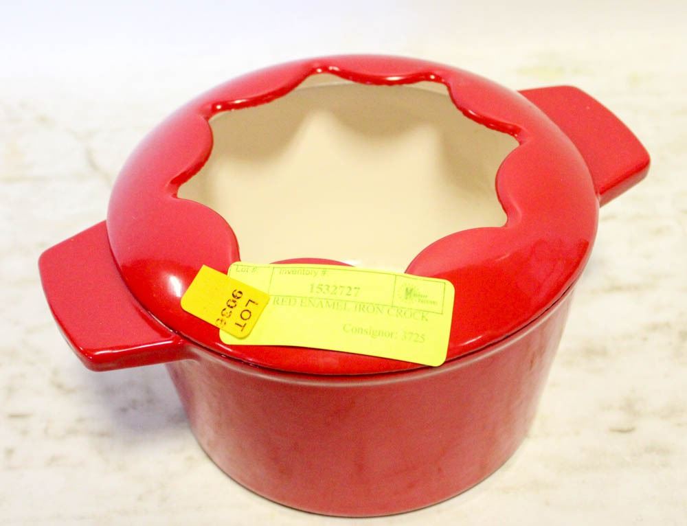 SMALL RED ENAMEL IRON CROCK POT