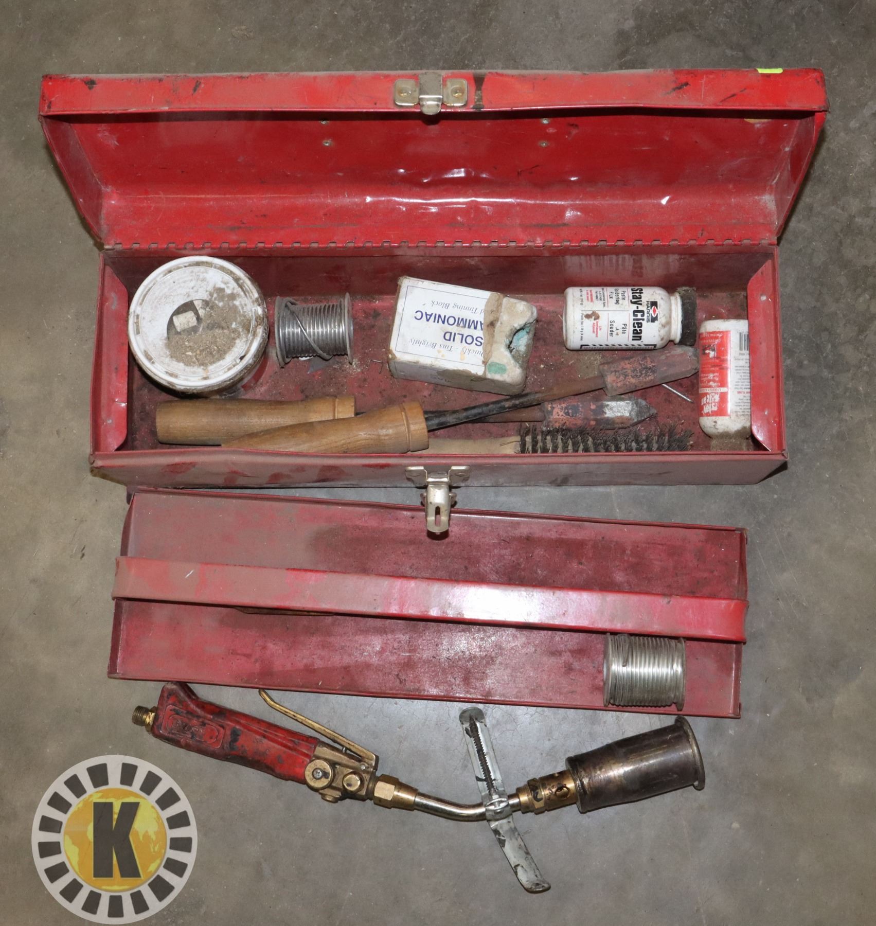 SMALL RED TOOL BOX FULL OF SOLDERING SUPPLIES
