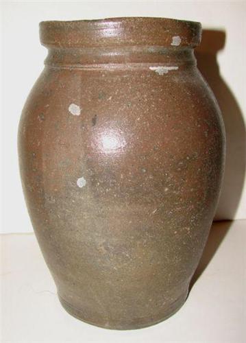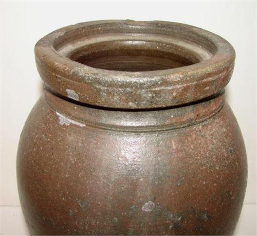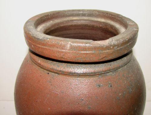 SMALL OVOID REDWARE CROCK. Shows some chipping at top rim. Shows one chip at edge of base. Shows one tight vertical hairline crack running from edge of base to body. Shows one crack at base. 8.5” H