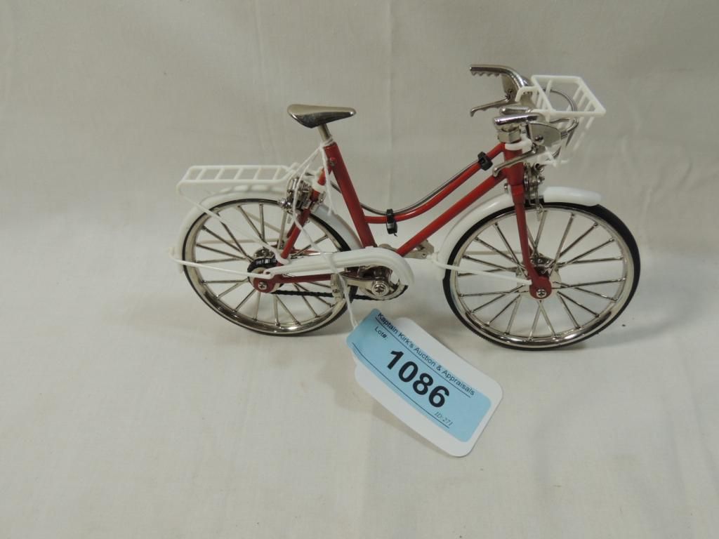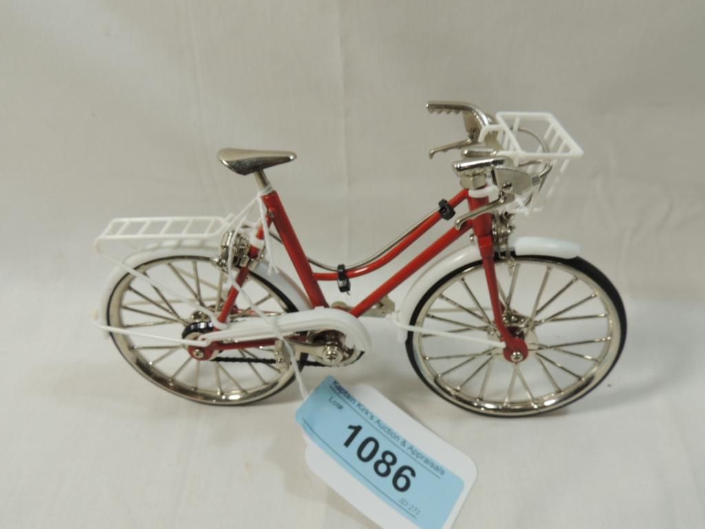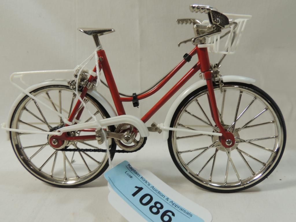 WORKING SMALL MODEL BICYCLE. RED BIKE WITH BASKET. AS SHOWN. SEE PHOTO FOR MORE DETAILS.